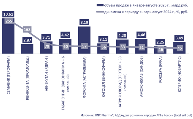 Рис. ТОР-10 торговых марок ЛП* по динамике продаж в розничном сегмента фармрынка РФ в январе-августе 2025 г.