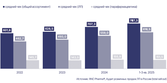 По информации базы данных «Аудит розничных продаж ЛП в России (total sell out)» аналитической компании RNC Pharma, по итогам 1-3 кв. 2025 г. в среднем по стране стоимость разовой покупки в аптечных учреждениях составляла 767 руб. (в розничных ценах, включая НДС) по всему ассортименту. Относительно аналогичного периода 2024 г. средний чек вырос на 10,8%, при этом, динамику полностью определяли лекарственные средства. Размер разовой покупки в отношении ЛП в отчётный период достигал 618 руб., увеличившись за год на 13,5%.