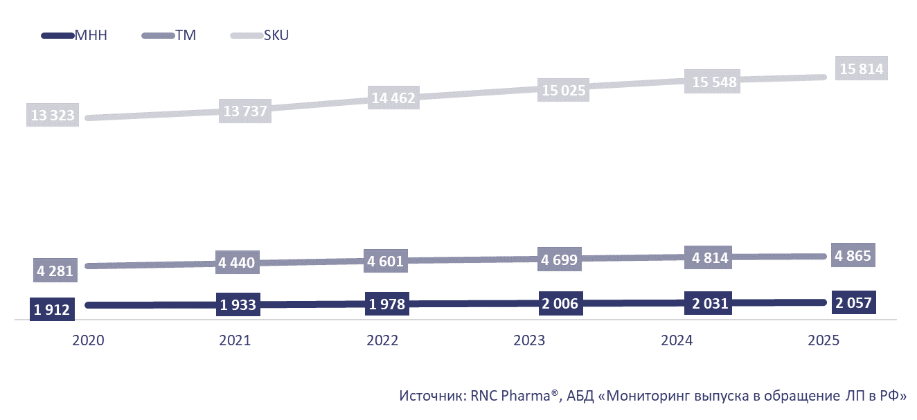 По информации базы данных «Мониторинг выпуска в свободное обращение ЛП в РФ» аналитической компании RNC Pharma в 2025 г. на российский фармрынок в обращение поступило более 15,8 тыс. SKU (stock keeping unit —идентификатор товарной позиции) лекарственных препаратов — относительно 2024 г. этот показатель вырос на 266 позиций. Характерно, что в 2025 г. темпы развития продуктовой матрицы замедлились почти вдвое, в 2024 г. относительно 2023 г. количество SKU на рынке выросло на 523 наименования. За 2025 год, количество брендов, выведенных в оборот, выросло на 51 позицию — так в течение 2025 г. на рынок отгружалось почти 4,9 тыс. разных торговых марок (ТМ). При этом число МНН, поступивших в оборот в минувшем году, составляло порядка 2,1 тыс. (+26 позиций к 2024 г.).