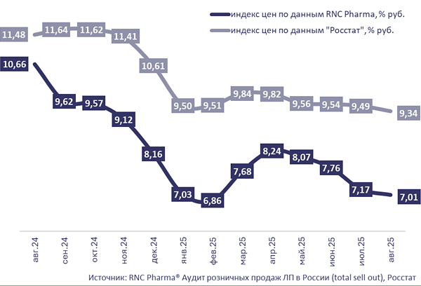 Официальные показатели российского статистического ведомства заметно выше реальной инфляции, рассчитанной по методу Ласпейреса, на основе информации базы данных «Аудит розничных продаж ЛП в России (total sell out)» аналитической компании RNC Pharma, которая составляла 7,17% по состоянию на январь-август 2025 г. и 7,01% в августе 2025 г. относительно августа 2024 г. Фактические показатели инфляции накопительным итогом на 2,4% меньше официального показателя, сопоставимые отличия наблюдаются и между августовскими значениями — на уровне 2,33%.